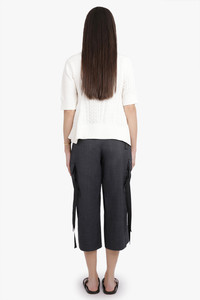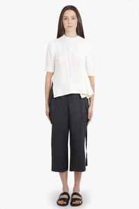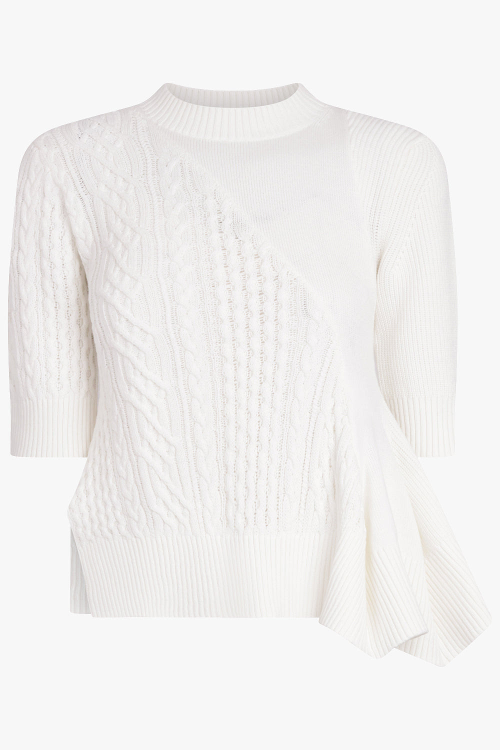 A sculptural reimagining of classic knitwear, the 3/4 Sleeve Chain Knit With Asymmetric Hem Detail features a softly structured silhouette with statement detailing. Crafted from a lightweight polyester knit in off-white, this piece is accented with a wool-blend textured panel and an asymmetric hemline for a dynamic, layered look. The 3/4 sleeves enhance the architectural shape, while the intricate knit construction offers both form and movement. - Main Fabrication: 100% Polyester - Attached Parts: 80% Wool, 20% Nylon - 3/4 length sleeves for a modern proportion - Chain knit texture with visual depth - Asymmetric hemline for directional shape - Contrasting wool-blend panel detail - Off-white colourway for timeless versatility Style with Sacai tailored trousers or skirts to balance its artful construction with refined ease.