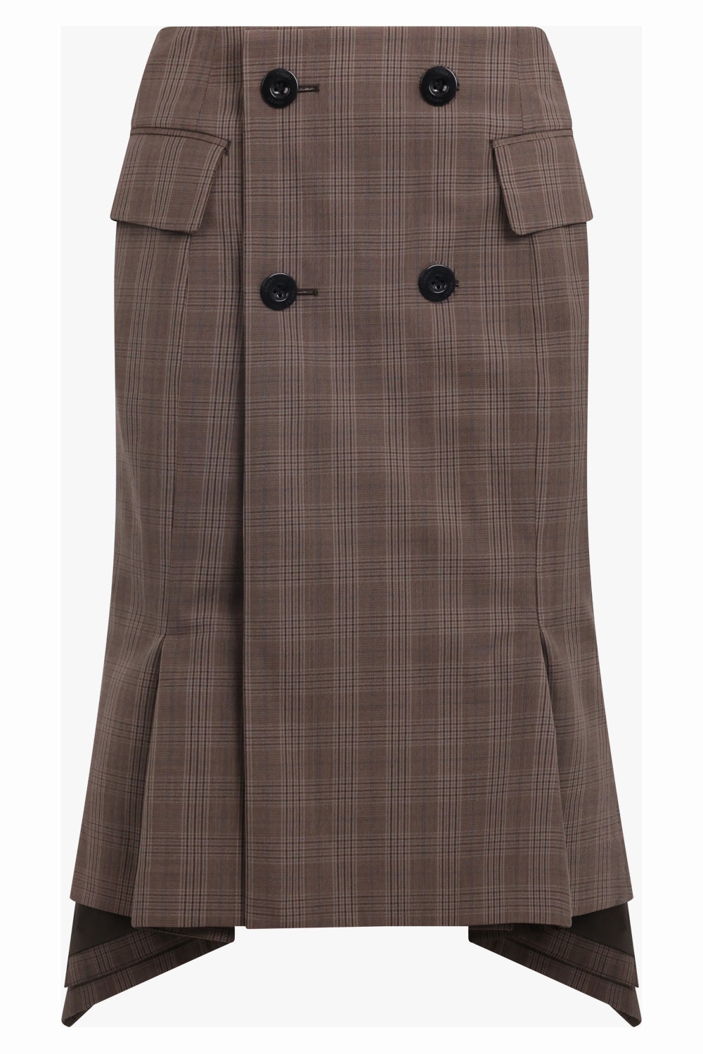 - Fabrication: 100% Cupro, Outer:100% Wool - Interlock twill weave - Layered design - Rear zip fastening - High waist - Check pattern - Pleat detailing - Decorative button detailing - Rear slit - Full lining - Straight hem - Mid-length Size and Fit Sophie: Model is 179cm/5’10” and is wearing a size JP1 Model Measurements: Bust: 76cm, Waist: 61cm, Hips 87.5cm Japanese sizing Fits true to size