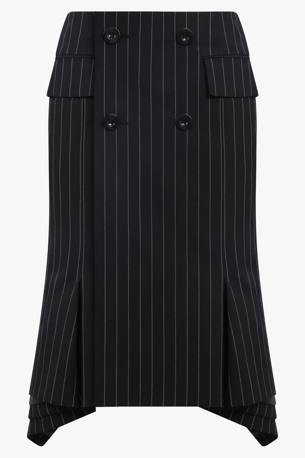 ASYMMETRIC FLARED HEM STRIPE MIDI SKIRT WITH BUTTON DETAIL | BLACK/WHITE