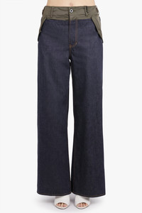 These wide-leg pants are crafted in structured cotton denim with a contrasting attached nylon overlay that adds dimension and utilitarian edge. Designed with belt loops and functional pockets, the silhouette is relaxed yet architectural, combining classic denim structure with layered technical elements. - Fabrication: Main 100% Cotton; Attached Layer: 100% Nylon - Structured denim with nylon contrast panel - Wide-leg fit with structured fit - Belt loops and functional pockets - Concealed fastening Pair with a a relaxed knit or other elevated essentials from Sacai to play with proportions and texture. Size and Fit Tiah: Model is 178cm/5’9” and is wearing a size JP2 Model Measurements: Bust: 86cm, Waist: 69cm, Hips 90.5cm Fits true to size Measurements JP0: Waist 66cm, Hip 82cm, Length 107cm JP1: Waist 70cm, Hip 86cm, Length 107cm JP2: Waist 74cm, Hip 90cm, Length 107cm JP3: Waist 76cm, Hip 92cm, Length 107cm