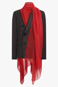 A contemporary take on classic tailoring, the Sacai Suiting Jacket in Red/Brown blends structured suiting with a modern twist, featuring a striking red interior that can be styled as a scarf detail or worn loosely for versatile, multi-wear options. Crafted from a luxurious wool-polyester blend, this blazer showcases a tailored silhouette with clean lines and refined finishing details. The red under-lining adds unexpected depth, while the structured shoulders and notch lapels emphasize its sharp, sophisticated shape. - Fabrication: 70% Polyester, 30% Wool - Tailored blazer silhouette with structured shoulders - Double breasted - Notch lapel detailing for a classic finish - Red under-lining that can be styled as a scarf detail or worn loosely to add visual interest - Long sleeves with refined cuffs - Front button closure for versatile styling - Clean lines with polished tailoring Pair with wide-leg trousers to elevate your polished, contemporary wardrobe. Size and Fit Tiah: Model is 178cm/5’9” and is wearing a size JP1 Model Measurements: Bust: 86cm, Waist: 69cm, Hips 90.5cm Fits true to size.