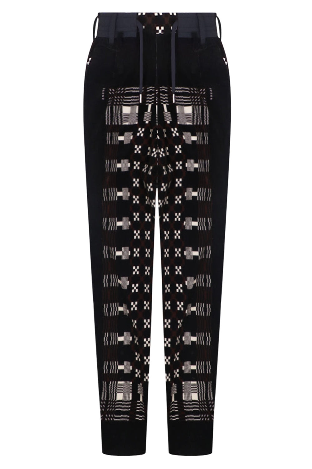 The Sacai Geometric Print Pants are crafted from cotton and are a tapered style, featuring a geometric print all over, belt loops, drawstrings, peating down the front and a slight drop crotch. Fabrication: 100% Cotton, 100% Polyester, 100% Cupro Size and Fit Sam: Model is 187cm/ 6’1” and is wearing a size JP2 Model Measurements: Bust: 91cm, Waist 76cm, Hips: 88cm Measurements Size 1: Waist 78cm, Hip 90cm, Length 102cm Size 2: Waist 82cm, Hip 94cm, Length 102cm Size 3: Waist 86cm, Hip 98cm, Length 102cm Size 4: Waist 90cm, Hip 102cm, Length 102cm