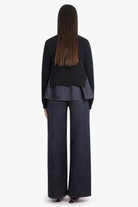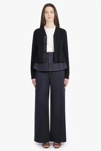 A contemporary layering essential, the Long Sleeve Knit Cardigan with Denim Underlay combines soft knitwear with rugged denim details for a fresh, hybrid aesthetic. Crafted from a cotton-polyester blend in black, this double-layered cardigan features an indigo blue denim underlay visible at the cuffs and hem. Functional buttons complete the look, offering versatility and a tailored finish to this relaxed yet structured piece. - Main Fabrication: 57% Cotton, 43% Polyester - Attached Parts: 100% Cotton, 100% Polyester - Long sleeve silhouette with double-layer construction - Indigo blue denim underlay at hem - Functional pockets - Button closure - Relaxed fit with structured detailing Wear over jeans or tailored trousers to create a balanced modern Sacai layered look.