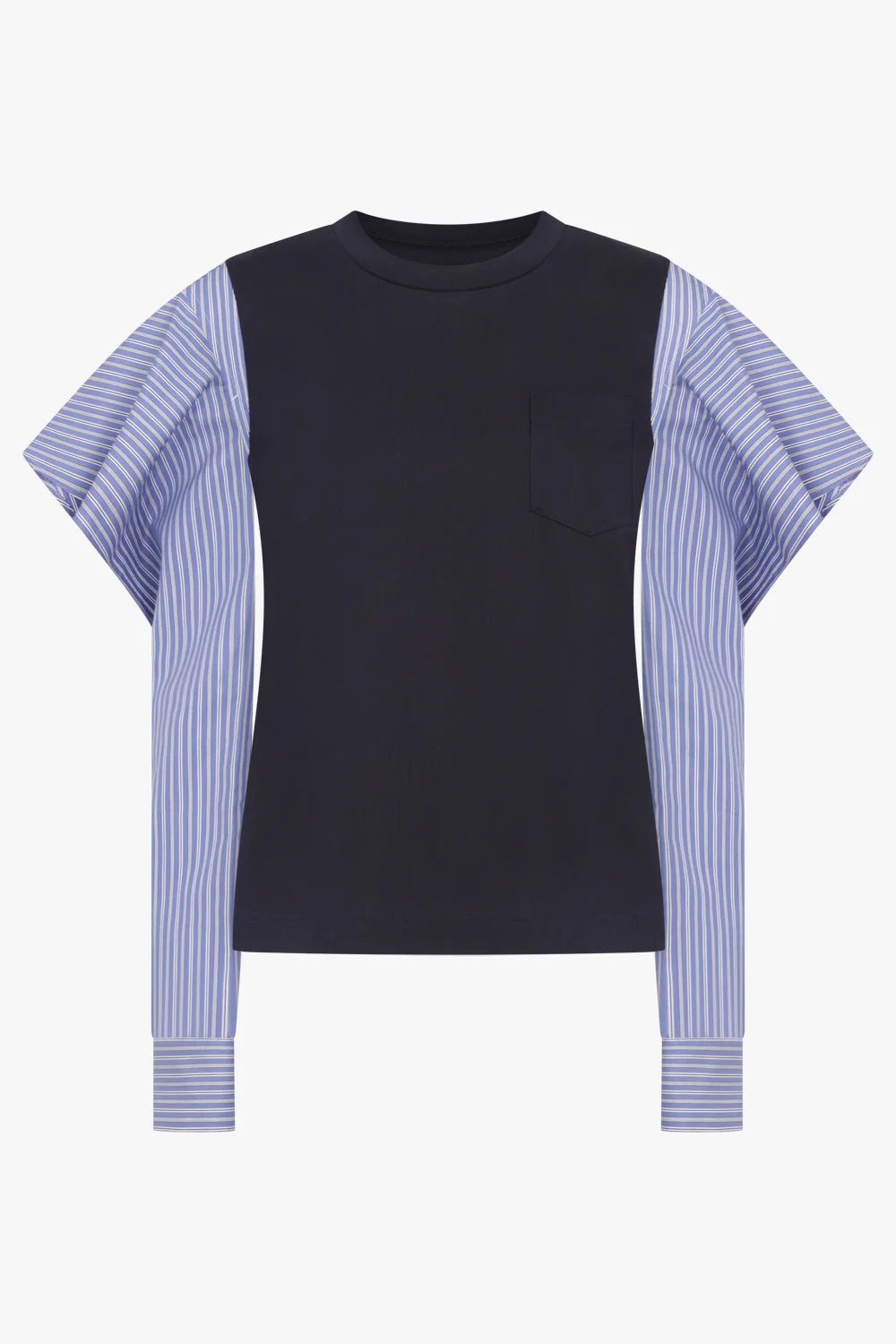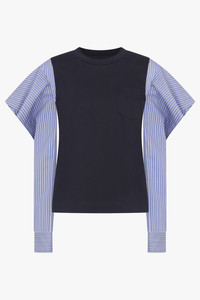 This long sleeve top is crafted from 100% cotton, offering a soft yet structured feel with a clean, classic finish. The silhouette is defined by cowl sleeves with open detailing in blue stripes that add volume and a sculptural touch, while a slightly relaxed fit keeps the design modern and wearable. Rendered in black with contrasting navy and blue striped sleeves, this piece blends everyday ease with Sacai’s distinctive design approach. - Fabrication: Cotton 100% - Cotton construction with structured feel - Long sleeves with cowl volume and open detailing - Relaxed fit - Black body with navy/blue striped sleeves Pair with tailored trousers or denim from Sacai to elevate your everyday wardrobe with smart sophistication.