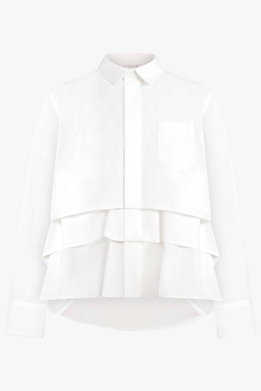 This refined poplin shirt is crafted from a crisp cotton-blend fabric, offering a clean, structured finish with a subtle sheen. The relaxed silhouette is complemented by a classic button-down front and a sharp, pointed collar, while the slightly cropped length adds a modern twist. In an off-white hue, this shirt embodies timeless elegance with a contemporary edge. - Fabrication: 65% Polyester, 35% Cotton - Cotton-blend poplin for structure and sheen - Relaxed fit with slightly cropped length - Button-down front with pointed collar - Long sleeves with buttoned cuffs Style with tailored trousers and loafers for a polished daytime look. Size and Fit Tiah: Model is 178cm/5’9” and is wearing a size JP1 Model Measurements: Bust: 86cm, Waist: 69cm, Hips 90.5cm Fits true to size.