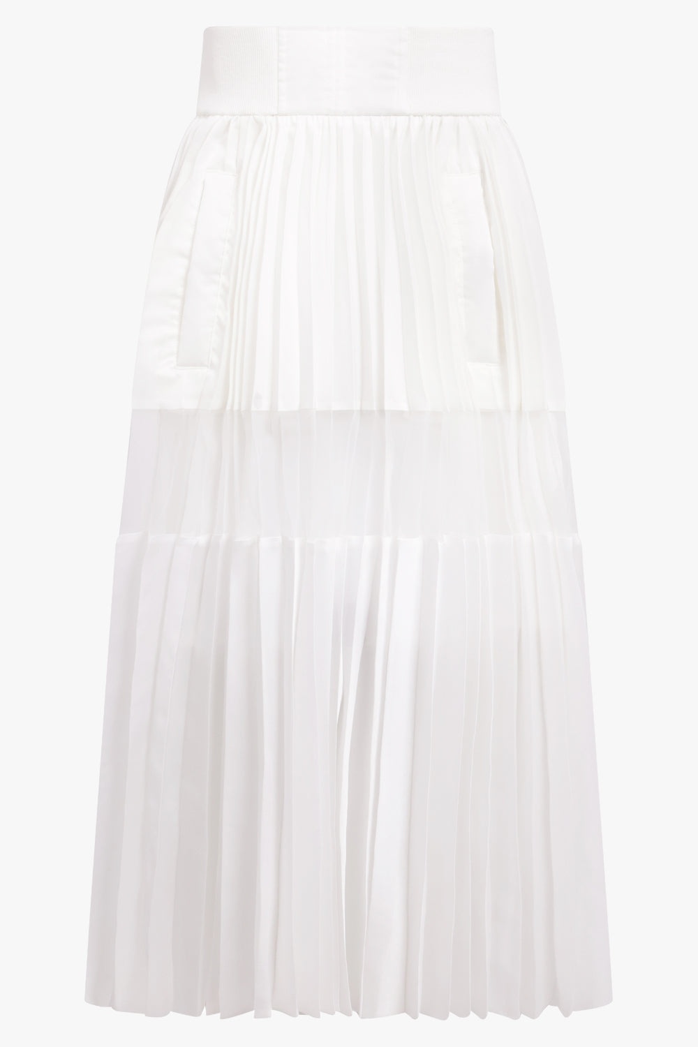 The Sacai Twill skirt is high waisted and the belted waist creates a flattering silhouette. The skirt features side flap and cargo pockets, adding both function and style. Its modern and sophisticated feel is complemented by a front slit and below-knee length, while the rear pleat detailing adds visual interest. This skirt features convenient side flap and cargo pockets, as well as a front slit and rear pleat detailing with a below-knee length. Fabrication: Nylon 100%, Attached Parts: Polyester 100%, Cotton 50%, Polyester 50% Size and Fit Sophie: Model is 179cm/5’10” and is wearing a size JP1 Model Measurements: Bust: 76cm, Waist: 61cm, Hips 87.5cm Japanese Sizing Fits true to size Measurements 1: Waist 68cm, Hip 74cm, Length 87cm 2: Waist 70cm, Hip 76cm, Length 87cm 3: Waist 72cm, Hip 78cm, Length 87cm