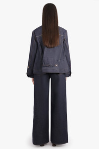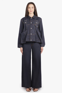 This peplum denim jacket is crafted from 100% cotton in a structured indigo wash. It features a cinched waist with a flared hemline for a defined silhouette, while oversized flap pockets and exposed seams add utility-inspired detail. A classic collar and button-front closure complete the design, blending feminine shape with workwear references. - Fabrication: 100% Cotton - Fitted waist with oversized peplum hem - Oversized chest and hip flap pockets - Button-front fastening and cuffs - Contrast topstitching A sculptural take on the denim jacket, layer over pants or skirts to for a utility inspired addition. Size and Fit Tiah: Model is 178cm/5’9” and is wearing a size JP2 Model Measurements: Bust: 86cm, Waist: 69cm, Hips 90.5cm Fits true to size Measurements JP1: Bust 100cm, Waist 120cm, Hip 120cm, Length 63cm JP2: Bust 104cm, Waist 122cm, Hip 122cm, Length 63cm JP3: Bust 108cm, Waist 124cm, Hip 124cm, Length 63cm