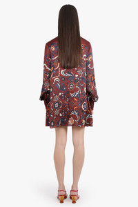 This mini dress is crafted in lightweight floral-print polyester with a soft drape and fluid silhouette. It features a high neckline with button fastening and long billowed sleeves with buttoned cuffs. The attached scarf panel enhances the elegant drape and movement, while the all-over bordeaux floral motif brings a romantic tone. - Fabrication: 100% Polyester; Attached Parts: 100% Polyester - High neck with button fastening - Long billow sleeves with button cuffs - Attached scarf panel - Floral print throughout - Mini length with a fluid drape Pair with heels for a elevated night-time look, or with pants for a layered paired back look. Size and Fit Tiah: Model is 178cm/5’9” and is wearing a size JP2 Model Measurements: Bust: 86cm, Waist: 69cm, Hips 90.5cm Fits true to size Measurements JP1: Bust 100cm, Waist 100cm, Hip 120cm, Length 82cm JP2: Bust 104cm, Waist 104cm, Hip 124cm, Length 82cm JP3: Bust 106cm, Waist 106cm, Hip 126cm, Length 82cm