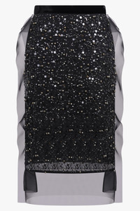 A refined study in contrast and texture, the Sequin Embroidery Sheer Midi Skirt in black is crafted with a layered construction that blends structure and fluidity. This elevated silhouette pairs a slim, high-rise fit with a delicate tulle overlayer, creating depth and movement with every step. Black and silver embellishments cascade across the front, offering a dynamic interplay of light and shadow. Velvet trim and tailored rear pockets ground the piece in Sacai’s signature hybrid tailoring, while the concealed fastening and rear slit ensure a clean, elongated finish. - Fabrication: Outer: 100% Polyester; Lining: 100% Cupro - Slim-fit, high-rise midi skirt with sheer tulle overlayer - Black and silver sequin embellishments across the front for dimensional shine - Concealed rear hook and zip fastening for a streamlined finish - Two rear button-fastening jetted pockets add tailored structure - Velvet trim for subtle texture contrast - Rear slit enhances movement and wearability Style it with the matching Sequin Embroidery Sheer Top for an effortless elevated look, or a crisp shirt to balance the skirt’s intricate detailing with modern ease. Size and Fit Tiah: Model is 178cm/5’9” and is wearing a size JP2 Model Measurements: Bust: 86cm, Waist: 69cm, Hips 90.5cm Fits true to size.