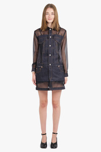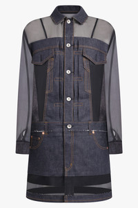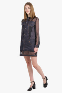 - Fabrication: - Main: 100% cotton - Attached: 100% polyester - Lining: 100% cupro - Sheer shirt dress with patchwork style denim overlay - Collar neckline - Centre front denim button closure - Long sheer sleeves with denim cuffs - Denim stitching detail - Back denim pockets - Adjustable waistband with denim buttons and tags