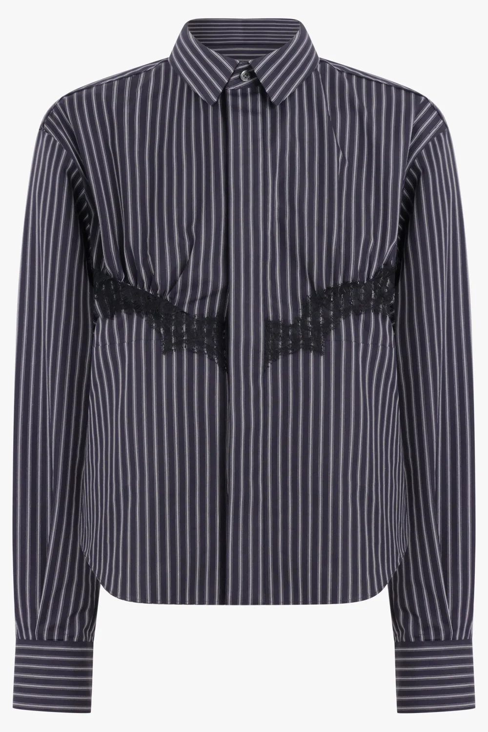 A refined reinterpretation of the classic striped shirt, this Sacai design highlights the brand’s signature hybrid aesthetic. Panelled construction introduces subtle contrast through layered textures and directional striping, creating movement and dimension across the silhouette. The structured profile is balanced by lightweight fabrication for everyday wear. Fabrication: 65% Polyester 35% Cotton Attached Parts: 100% Polyester Classic shirt silhouette Panelled construction Stripe pattern detailing Button front closure Navy stripe colourway Designed to pair with relaxed tailoring or layered styling for a contemporary wardrobe. Measurements 1: Bust 96cm, Waist 96cm, Hip 96cm, Length 63cm 2: Bust 98cm, Waist 98cm, Hip 98cm, Length 63cm 3: Bust 100cm, Waist 100cm, Hip 100cm, Length 63cm 4: Bust 102cm, Waist 102cm, Hip 102cm, Length 63cm