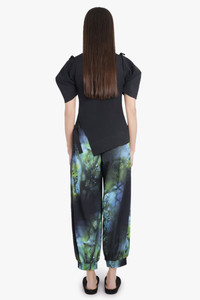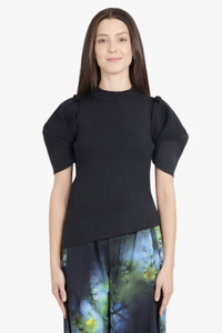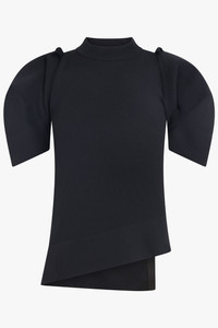 Bold yet refined, the Structured Shoulder Short Sleeve Asymmetric Knit Pullover in black delivers a sculptural silhouette with modern texture. Crafted from 100% polyester with wool-blend attached panels, this piece features a dimensional chain-knit texture and sharp structured shoulders that define the form. The asymmetric hemline creates dynamic movement, while 3/4 sleeves bring balance and versatility to the silhouette. - Main Fabrication: 100% Polyester - Attached Parts: 80% Wool, 20% Nylon - Structured shoulders for bold shape - Chain-knit texture adds visual depth - Asymmetric hemline for a modern finish - 3/4 length sleeves - Sleek black hue for versatile styling Pair with tailored trousers or midi skirts to create a striking, balanced look.