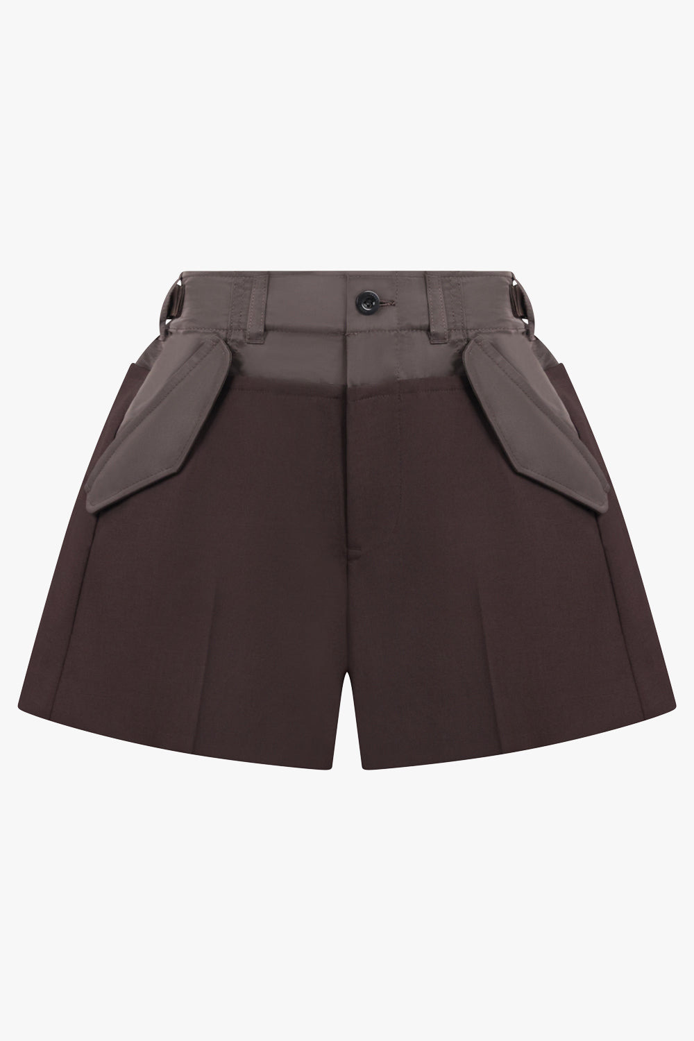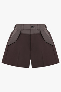 The Suiting Mix Shorts are crafted from a nylon and wool blend with a polyester filling, reimagining tailoring with a modern edge. Rendered in a classic chocolate brown, the shorts feature a suiting-inspired contrast design with sharp front pleats and structured pockets. The tailored silhouette is offset by subtle utility detailing, making them a versatile staple that transitions seamlessly from day to evening. - Fabrication: Polyester 70%, Wool 30% - Attached Parts: Nylon 100%, Liner: Cupro 100%, Filling: Polyester 100% - Tailored suiting-inspired short - Structured pockets and front pleats - Contrast fabric panelling - Classic chocolate brown hue - Modern balance of sharp tailoring and casual ease Style with a crisp shirt or pair with a relaxed knit for effortless everyday wear. Size and Fit Tiah: Model is 178cm/5’9” and is wearing a size JP2 Model Measurements: Bust: 86cm, Waist: 69cm, Hips 90.5cm Fits true to size.