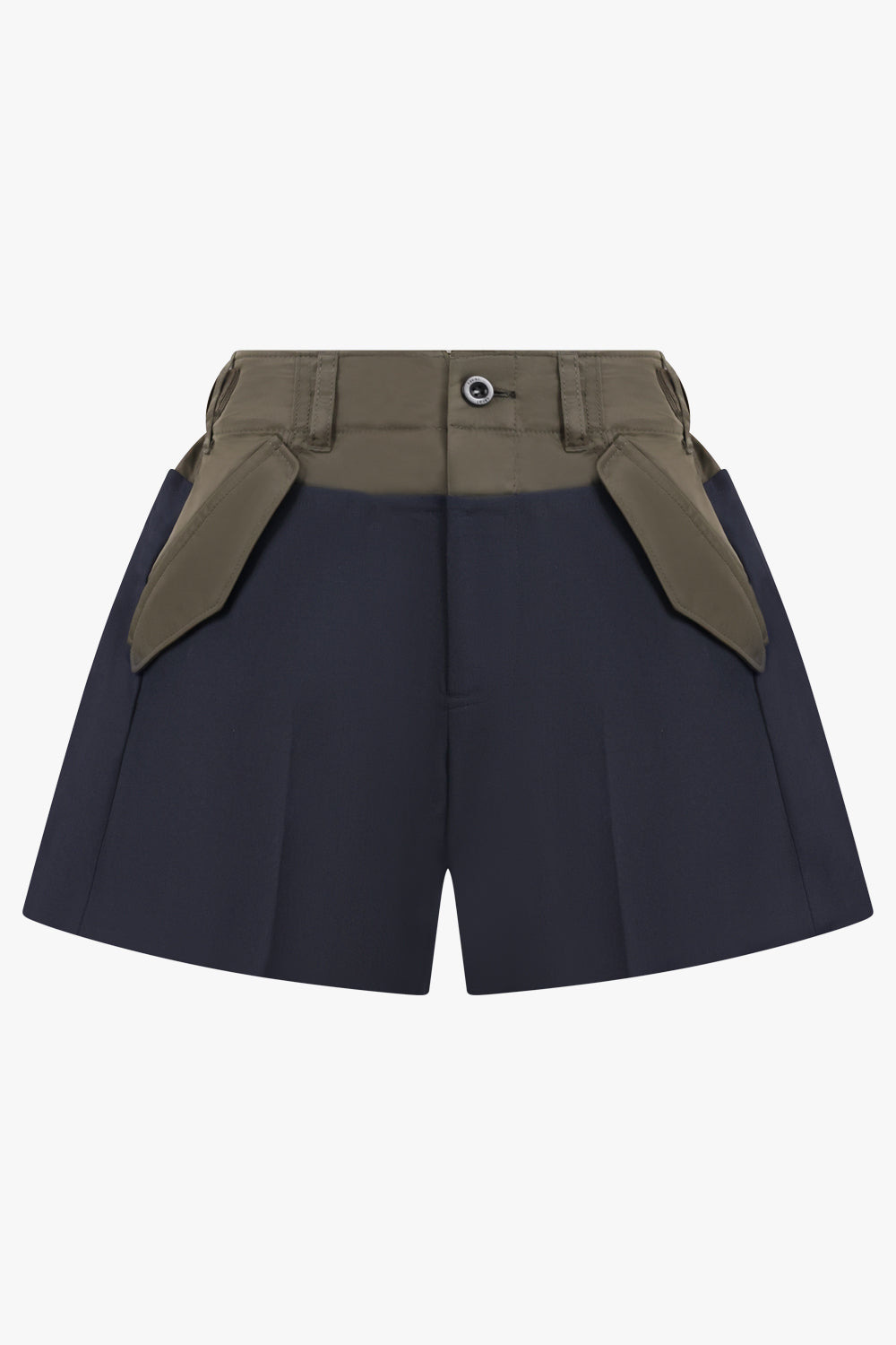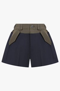 The Suiting Mix Shorts are crafted from a nylon and wool blend with a polyester filling, merging sharp tailoring with utilitarian contrast. Designed in a deep navy base and finished with a dark khaki waistband and pocket detailing, the shorts bring a modern twist to classic suiting. Structured pleats and contrast fabric panelling enhance the tailored silhouette, balancing refinement with everyday ease. - Fabrication: Polyester 70%, Wool 30% - Attached Parts: Nylon 100%, Liner: Cupro 100%, Filling: Polyester 100% - Tailored suiting-inspired short - Structured pockets and front pleats - Contrast waistband and pocket detailing - Deep navy base with dark khaki accents - Modern balance of sharp tailoring and casual ease Style with a crisp shirt and loafers for an elevated look, or pair with a relaxed tee for off-duty polish. Size and Fit Tiah: Model is 178cm/5’9” and is wearing a size JP2 Model Measurements: Bust: 86cm, Waist: 69cm, Hips 90.5cm Fits true to size.