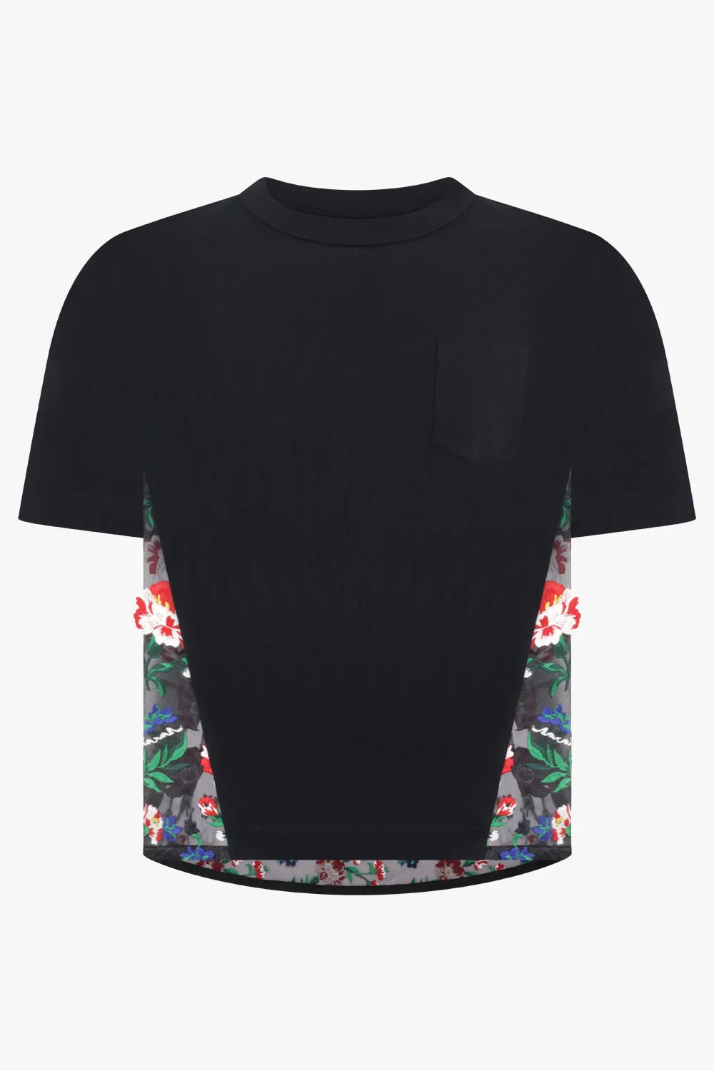 Blending everyday ease with Sacai’s signature hybrid construction, this T-shirt features floral detailing integrated into contrast side panels. The relaxed silhouette maintains a classic profile while the embroidered elements introduce texture and visual depth, reflecting the brand’s distinctive design language. Fabrication: 100% Cotton Attached Parts: 100% Polyester Relaxed T-shirt silhouette Floral panel detailing Short sleeve design Soft cotton construction Black colourway A modern wardrobe staple designed to pair seamlessly with both tailored and casual pieces. Measurements 1: Bust 96cm, Waist 96cm, Hip 96cm, Length 62cm 2: Bust 100cm, Waist 100cm, Hip 100cm, Length 62cm 3: Bust 104cm, Waist 104cm, Hip 104cm, Length 62cm