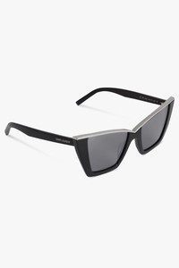 Saint Laurent's Silver Trim Cat Eye Sunglasses feature square cat-eye frames in a glossy black acetate. Trimmed with a silver-tone metal bar and finished with grey lenses. Material: 100% Acetate Size and Fit Standard fit Measurements Lens width: 5.4 cm Bridge size: 1.7 cm Temple: 14.5 cm
