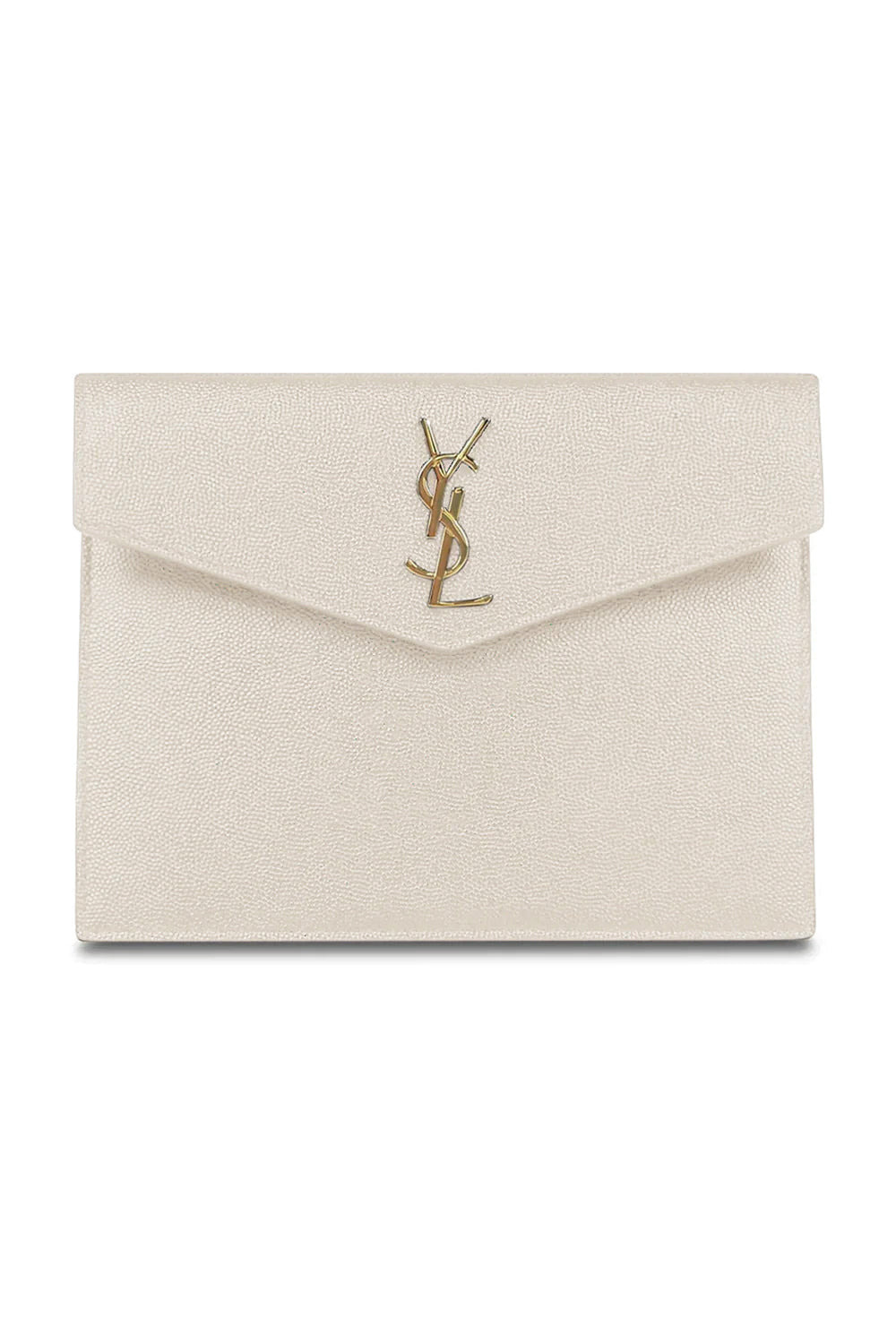 The Saint Laurent Small Uptown Pouch features a metal YSL monogramme at the front. It is crafted from a luxurious grained calfskin leather with a magnetic envelope closure. Fabrication: 100% Grained Calfskin Leather Measurements Width: 20cm, Height: 15cm, Depth: 1.5cm
