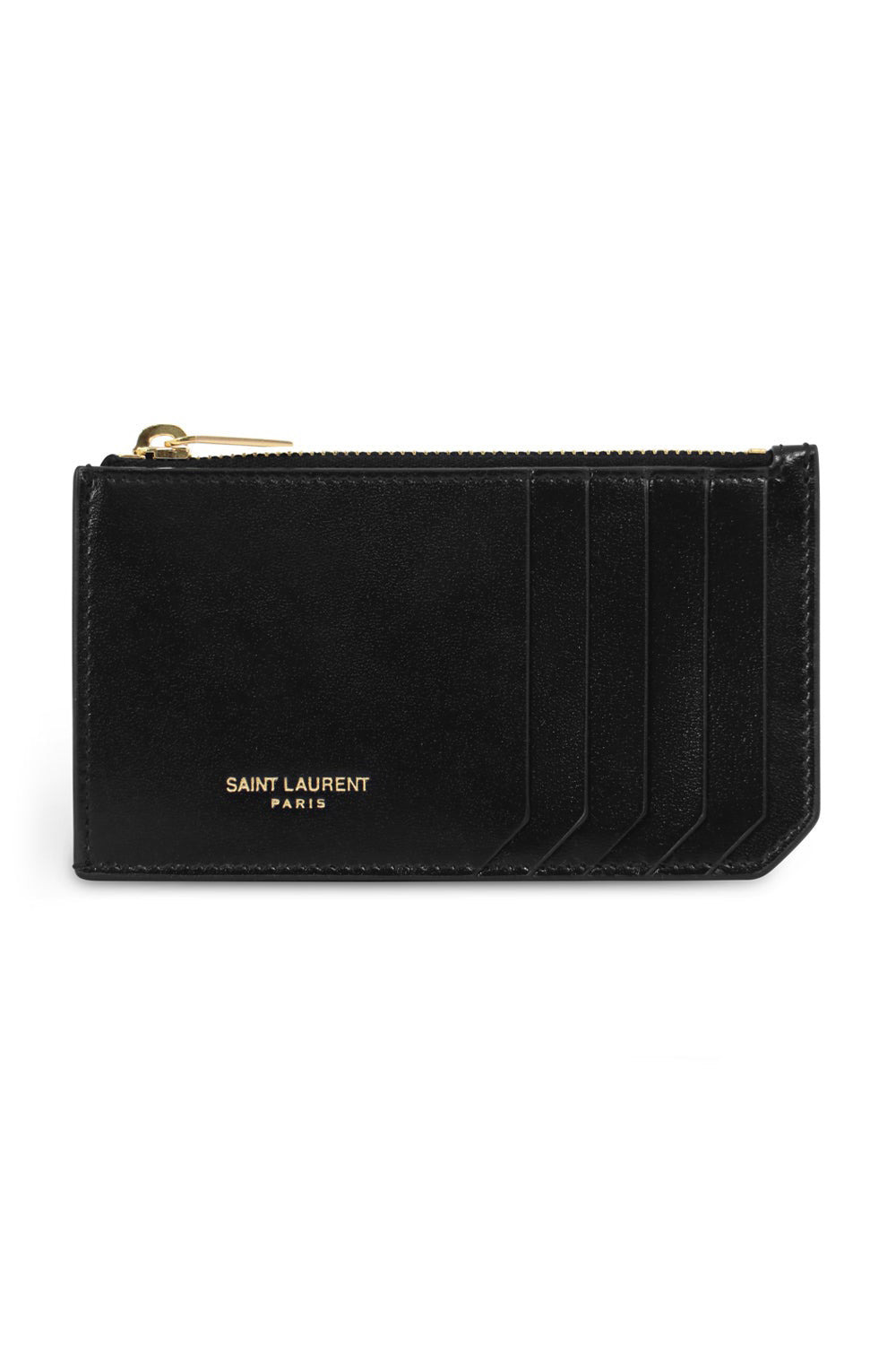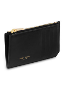 The Saint Laurent Card Holder is a man-style wallet that features multiple card slots, a front embossed logo stamp, top zip closure and gold hardware. The perfect gift! Fabrication: 100% Calfskin Leather Measurements Width: 13cm, Height: 8cm, Depth: 0.5cm