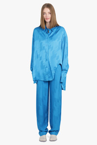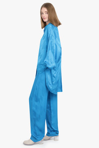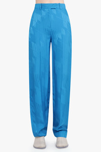 Jagger monogram wide-leg trousers from The Attico featuring capri blue, cotton, monogram jacquard, high waist, two side slit pockets, two rear welt pockets, concealed fly and button fastening, belt loops, logo patch to the rear and wide leg. Fabrication: 100% Viscose Size and Fit Nikita: Model is 174cm/5’7” and is wearing a size IT38 Model Measurements: Bust: 30cm, Waist: 26.5cm, Hips 34cm Italian Sizing Fits true to size Measurements Size 38: Waist 77cm, Hip 100cm, Length 119cm Size 40: Waist 80cm, Hip 104cm, Length 119cm Size 42: Waist 84cm, Hip 108cm, Length 119cm Size 44: Waist 88cm, Hip 116cm, Length 119cm