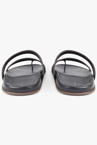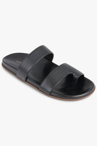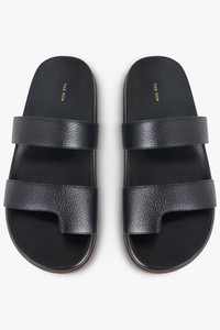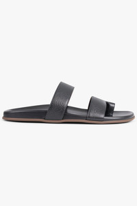 - Fabrication: Upper 100% Capra Hircus, Lining 100% Ovis Aries, Sole 100% Rubber - Minimalist double strap slide in black grained leather - Soft leather toe loop for secure fit and elevated design detail - Flat leather insole with cushioned feel for comfort - Smooth rubber sole for grip and durability - Sleek, open-toe silhouette suitable for everyday wear - Premium natural materials selected for breathability and long-lasting quality Size and Fit True to size