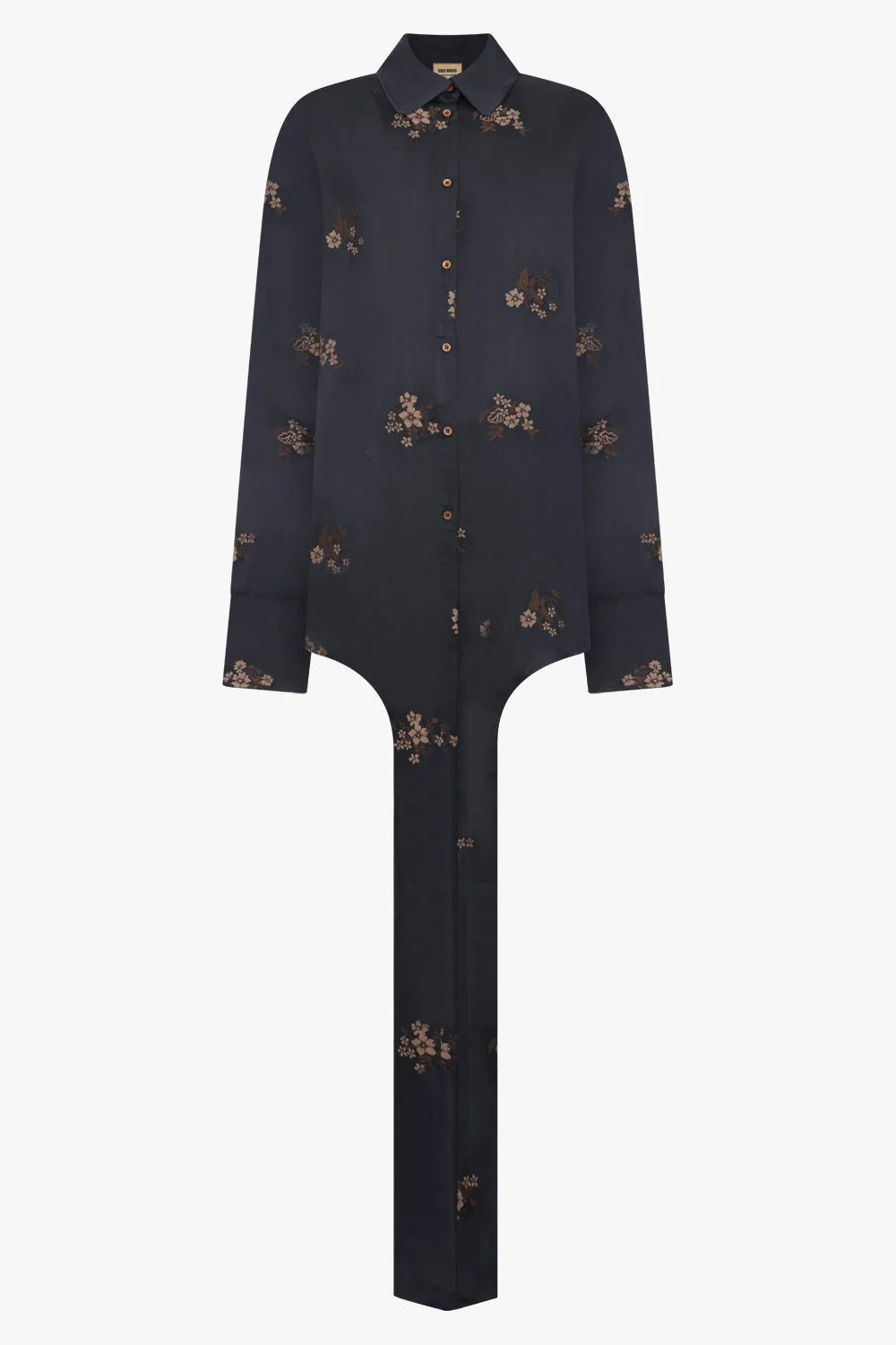 An elegant fusion of versatility and refined detailing, the L/S Tubby Floral Print Tie Neck in Black/ Tan by Uma Wang elevates a classic shirt silhouette with flowing, multifunctional elements. Crafted from a luxurious blend of viscose and cupro, this shirt features long sleeves with two-button cuffs, a traditional collar, and a button-down front, combining structure with fluid movement. Long drapes cascading from the front offer styling versatility—they can be tied at the waist for definition or loosely around the neck for a relaxed, contemporary look. A subtle floral print throughout adds delicate texture and a soft visual appeal. - Fabrication: 58% viscose, 42% cupro - Long sleeves with two-button cuffs for a tailored finish - Button closure with collar for classic structure - Detailed floral embroidery throughout for artisanal texture - Long drapes at the front for versatile styling—tie at the waist or neck, or wear loosely - Subtle floral print throughout adds refined texture and visual interest - Relaxed yet polished fit that balances structure with movement Style it with tailored trousers or a sleek skirt for a modern, sophisticated daytime ensemble.
