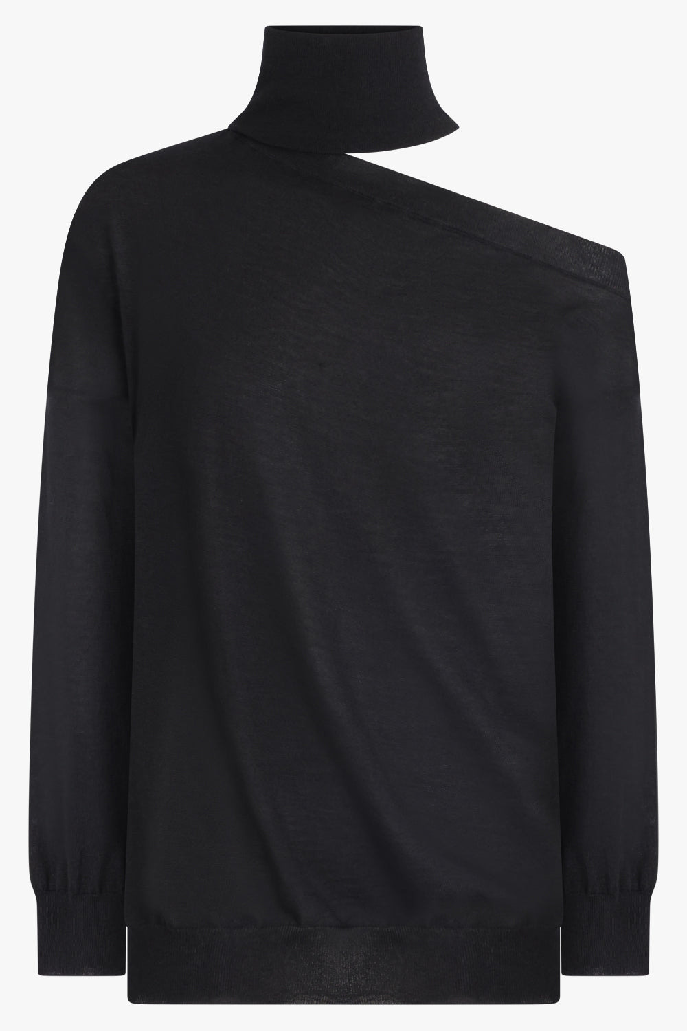 Simple yet striking, this Valentino Garavani jumper is defined by a cut-out on the shoulder revealing a flash of skin. Cut from a blend of virgin wool and silk in a timeless black hue, the garment features a roll neck and dropped shoulders. Fabrication: 70%Cashmere 30%Silk Size and Fit Sophie: Model is 189cm/6’02” and is wearing a size IT38 Model Measurements: Bust: 76cm, Waist: 61cm, Hips 87.5cm Italian sizing Fits true to size Measurements Size XS: Bust 126cm, Waist 126cm, Hips 126cm, Length 68cm Size S: Bust 128cm, Waist 128cm, Hips 128cm, Length 68cm Size M: Bust 130cm, Waist 130cm, Hips 130cm, Length 68cm