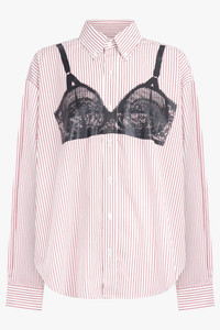 A playful twist on classic shirting, the Trompe L’oeil Button Down in red stripe is crafted from crisp cotton for a relaxed yet refined silhouette. This statement shirt juxtaposes traditional tailoring with bold, subversive detailing, featuring a trompe l’oeil black lace bra print across the front. The button-down collar and long sleeves anchor the look in classic shirting traditions, while the vivid red stripes on a white base inject a contemporary, eye-catching edge. - Fabrication: 100% Cotton - Classic cotton stripe shirt in red and white - Trompe l’oeil black lace bra print for a statement, graphic detail - Button-down collar and long sleeves for a timeless tailored feel - Button front closure for functional ease - Crisp cotton construction offers structured yet wearable comfort Style it with high-waisted trousers or a denim skirt to balance the bold graphic with modern minimalism. Size and Fit Tiah: Model is 178cm/5’9” and is wearing a size S Model Measurements: Bust: 86cm, Waist: 69cm, Hips 90.5cm Fits true to size