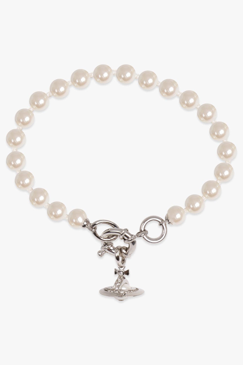Aleksa Pearl Bracelet features a row of 8mm creamrose glass-based baroque pearls. Each pearl is hand-knotted on the thread. A spring lock fastens the bracelet securely, from which hangs a 3d classic orb set with crystals, with a single pearl in the Saturn rings centre. Baroque Pearls will vary slightly in shape and size. Fabrication: 100% Brass Made in Thailand Size and Fit Lacey: Model is 180cm/5'11''