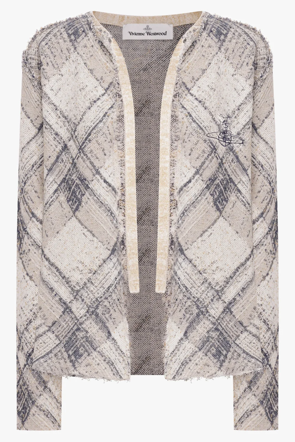 Vivienne Westwood’s Broken Tartan Cardigan in Gold/Multi reinterprets heritage knitwear through the house’s signature deconstructed lens. Crafted in a cotton-linen blend, the piece features a tartan jacquard disrupted by ‘broken stitch’ detailing — an intentional irregularity that echoes Westwood’s long-standing fascination with imperfection. Exposed seams and raw edges enhance the undone aesthetic, while the relaxed silhouette offers ease and wearability. The result is a knit that feels both considered and instinctively rebellious. Fabrication: Linen, Cotton, Viscose, Polyester blend Tartan jacquard fabrication ‘Broken stitch’ detailing Exposed seams and raw edges Relaxed cardigan silhouette Button front closure Gold/Multi colourway A directional knit grounded in British heritage with a subversive twist.