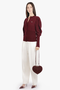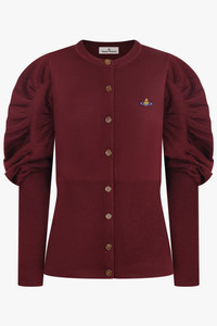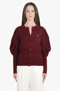 The Eli Balloon Shoulder Knit Cardigan is crafted from pure virgin wool in a warm brick red tone, featuring a fitted silhouette and voluminous balloon sleeves for a striking yet wearable shape. Ribbed finishings at the cuffs and waist enhance the fit, while branded Vivienne Westwood buttons and a multicoloured embroidered orb at the chest deliver the label’s unmistakable signature. - Fabrication: 100% virgin wool - Fitted silhouette with statement balloon shoulders - Round neckline for a classic finish - Ribbed cuffs and waistband for structure and shape retention - Full front button closure with branded Vivienne Westwood buttons - Multicoloured embroidered orb emblem on chest - Hip length for versatile styling Pair with tailored trousers or high-waisted skirts for a refined look with a playful, modern twist. Size and Fit Tiah: Model is 178cm/5’9” and is wearing a size S Model Measurements: Bust: 86cm, Waist: 69cm, Hips 90.5cm Fits true to size Measurements S: Bust 88cm, Waist 80cm, Hip 74cm, Length 64cm M: Bust 96cm, Waist 86cm, Hip 80cm, Length 64cm L: Bust 104cm, Waist 92cm, Hip 86cm, Length 64cm