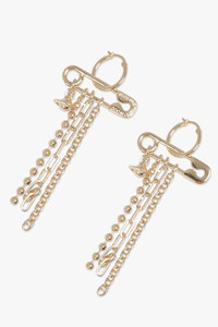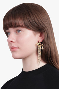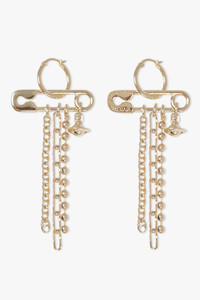 The Vivienne Westwood Ginetta Earrings are crafted from gold-tone brass and shaped into a bold hoop silhouette with secure clasp fastening. The design incorporates the house’s iconic safety pin motif, adorned with cascading chains and an asymmetric orb charm — a nod to Vivienne’s signature punk aesthetic. Finished with engraved branding and a polished surface, this statement pair adds edge and movement to any look. - Main material: 100% Brass - Gold-tone plating - Hoop silhouette with clasp fastening - Signature safety pin detail - Mixture of cascading chain elements - Orb charm feature - Asymmetric charm placement for added interest - Engraved branding - Bold, statement-making design - Polished finish Style with Vivienne Westwood accessories for a modern punk-luxe statement. Measurements Height: 0.8cm, Depth: 3.1cm
