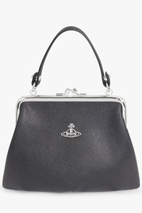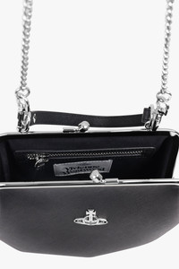 A contemporary take on heritage design, the Granny Frame Outline Orb Purse in Black is crafted from a durable poly-cotton and polyurethane blend for a structured, lasting finish. This statement accessory elevates the classic top-handle silhouette with a saffiano-embossed texture, combining functional detailing with signature Vivienne Westwood design. - Fabrication: 16% Poly-cotton, 30% RePoly-cotton, 54% Polyurethane - Silver-tone framework adds a polished, luxe finish - Zipped interior pocket provides secure storage - Fully lined for refined construction and durability - Removable chain strap allows versatile styling - Top-handle silhouette ensures classic, structured appeal - Saffiano-embossed motif completes the signature Westwood look - Comes with a Vivienne Westwood dust bag Style it with tailored ensembles or eveningwear for a sophisticated, fashion-forward statement.