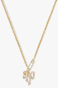 The Lilith Bow X Safety Pin Pendant Necklace in gold captures the brand’s rebellious yet romantic aesthetic through a fusion of punk-inspired detailing and refined craftsmanship. The necklace features a sculpted bow charm intricately intertwined with a signature safety pin pendant — a recurring emblem of Vivienne Westwood’s avant-garde heritage. Crafted in polished silver-tone plating, the piece is suspended from a fine chain for an effortlessly elegant finish. - Main material: 100% Brass - Silver-tone polished plating - Bow charm intertwined with safety pin pendant - Adjustable chain with lobster clasp fastening - Lightweight, wearable construction - Engraved Vivienne Westwood branding - Designed with a balance of edge and sophistication Style it with a structured Vivienne Westwood handbag for a touch of subversive elegance.