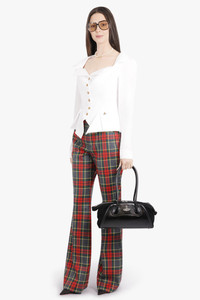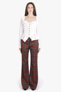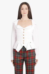 This shirt balances architectural precision with soft detailing, crafted from lightweight 100% organic cotton. Origami-like folds at the neckline meet letter-engraved buttons, while a signature multi-coloured orb embroidery marks the hip with subtle distinction. The fitted bodice flows into a flared, pleated waist extension, complemented by elegantly puffed shoulders. - Fabrication: 100% Organic Cotton - Bright white with contrasting button closure - Long-line silhouette with fitted bodice and flared pleated waist - Low collar with origami-inspired fabric folds - Letter-engraved button fastenings - Multi-coloured orb embroidery at hip - Elegantly puffed shoulders for volume and structure - Darting detail for tailored fit - Lightweight, unlined design - Long sleeves Style with additional Vivienne Westwood Icons to complete the look. Size and Fit Tiah: Model is 178cm/5’9” and is wearing a size IT40 Model Measurements: Bust: 86cm, Waist: 69cm, Hips 90.5cm Fits true to size Measurements 40: Bust 86cm, Waist 72cm, Hip 72cm, Length 58cm 42: Bust 88cm, Waist 74cm, Hip 74cm, Length 58cm 44: Bust 92cm, Waist 78cm, Hip 78cm, Length 58cm 46: Bust 96cm, Waist 82cm, Hip 82cm, Length 58cm 48: Bust 102cm, Waist 88cm, Hip 88cm, Length 58cm
