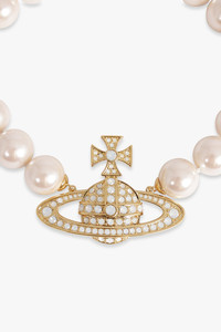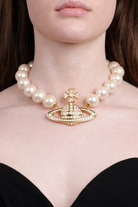 - Fabrication: 100% Brass - Orb motif covered in - Preciosa crystals - Gold-tone plating - Adjustable lobster clasp Measurements Total chain length: 42cm - 44cm Orb dimensions: height 5.5cm, width 7.5cm Pearl dimensions: 2cm