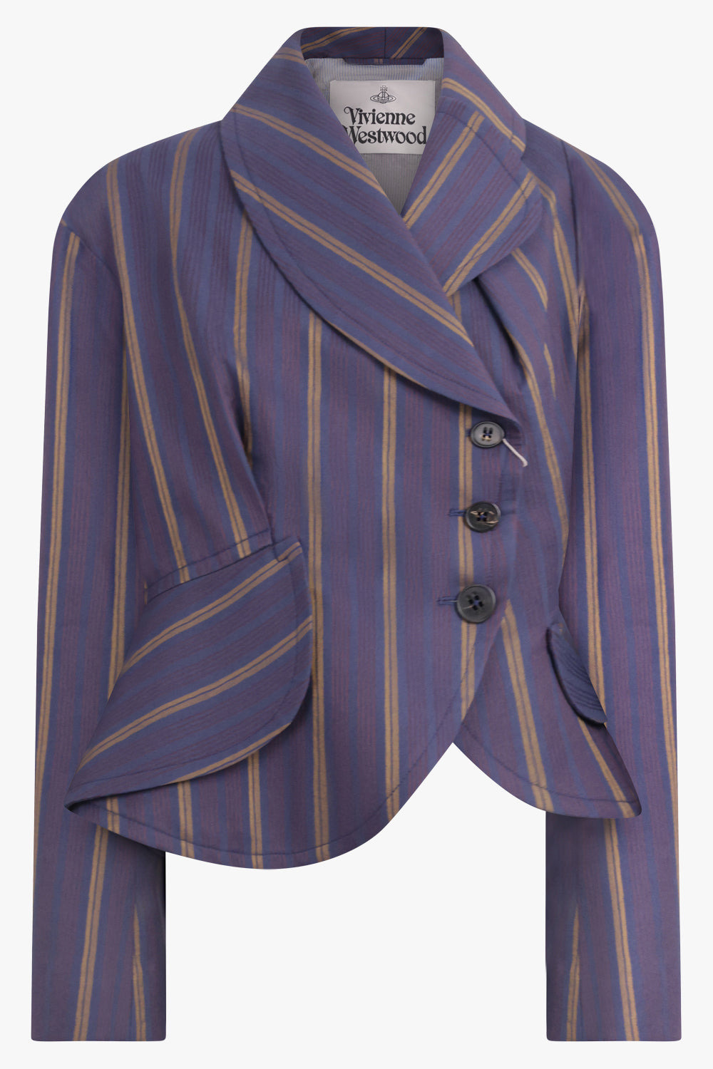 The Stormy Jacket is a refined interpretation of tailored structure and fluid drape. Crafted in a cotton-blend stripe fabrication in Dusk Blue and Mustard, the fabric undergoes a unique overdyeing process that deepens the base tone while allowing the polyester yarns to retain their contrast, creating dimensional depth and texture. The silhouette features Vivienne Westwood’s signature asymmetric construction, with buttons fastened diagonally across the front to create a sculptural, wrapped effect. A wide folded collar and cinched waist further accentuate the form, while the curved hemline lends a softened finish. - Fabrication: 96% Cotton, 4% Polyester - Overdyed stripe fabrication with dimensional contrast - Asymmetric front fastening with diagonally placed buttons - Fold-over collar and sculptural wrapped silhouette - Cinched waist and curved hem to enhance the feminine shape - Structured yet fluid fabrication for refined movement - Signature Westwood tailoring with deconstructed detailing Style with the matching Balloon Stripe Print Shorts and platform shoe for a modern expression of Westwood’s deconstructed elegance. Size and Fit Tiah: Model is 178cm/5’9” and is wearing a size S Model Measurements: Bust: 86cm, Waist: 69cm, Hips 90.5cm Fits true to size
