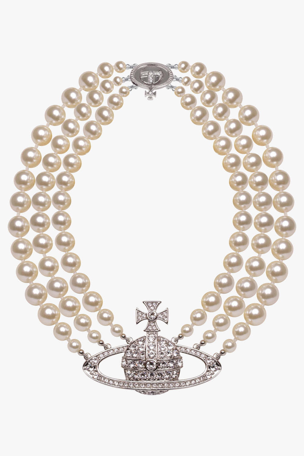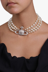Three Row Pearl Bas Relief Choker features three hand knotted rows of Swarovski pearls meeting together at a branded closure at the back, the necklace is complemented with the signature silver Orb, elegantly placed to the centre. Fabrication: 100% Brass Measurements Pearl Chain Length: 38cm Orb dimensions: Height 4.2cm, Width 5.1cm