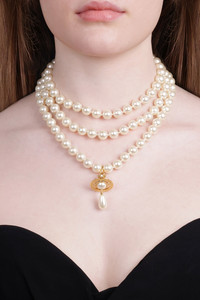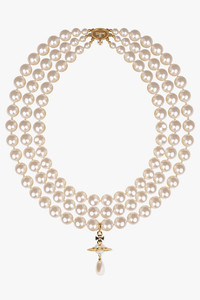 The gold-tone Three-Row Pearl Drop choker first appeared in Vivienne's 1990 'Portrait' collection and features our three-dimensional orb motif. Material: 100% Brass