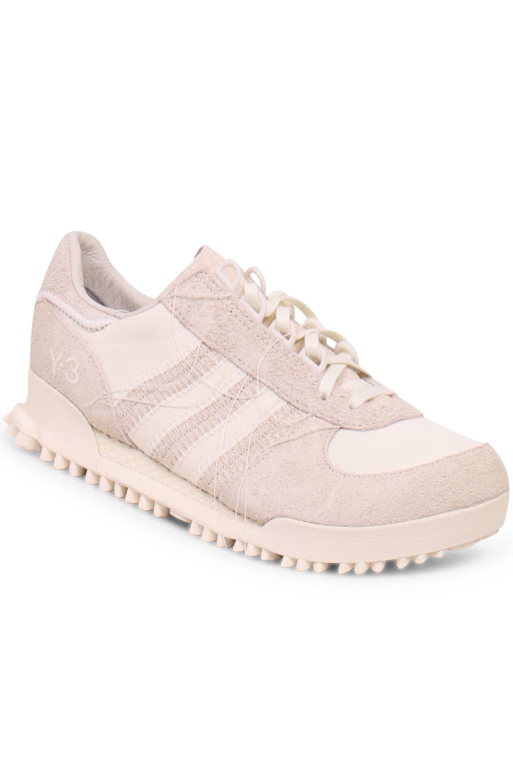 Y-3's Marathon Trainer in off white features a lace-up sneaker with subtle patterning of the adidas three stripe logo with some free-form threads. Fabric: Rubber and Suede Size and Fit Fits true to size UK Sizing Model is wearing a size UK9