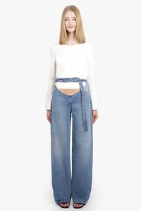 The Y/Project Y Belt Arc Denim Jeans in Faded Blue is fabricated from cotton. This style features a low rise, loose fit with an arc shaped waistline and attached Y belt. Fabrication: 100% Cotton Size and Fit Nikita: Model is 174cm/5’7” wearing a size FR34 Model Measurements: Bust: 30cm, Waist: 26.5cm, Hips 34cm French sizing Fits true to size Measurements Size 25: Waist 72cm, Hips 78cm, Length 113cm Size 26: Waist 76cm, Hips 82cm, Length 113cm Size 27: Waist 80cm, Hips 86cm, Length 113cm