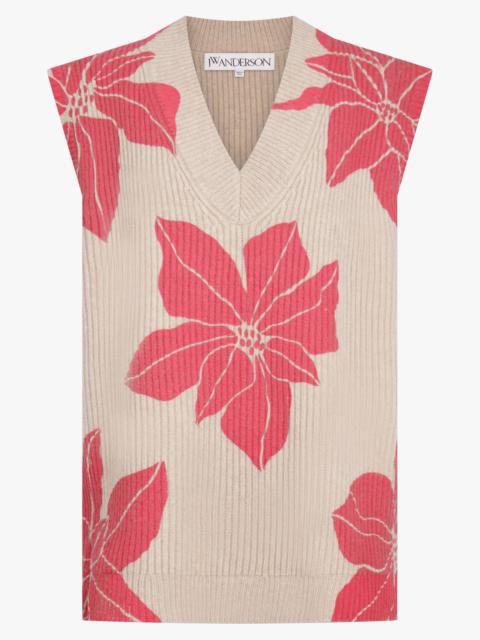 FLORAL PRINT V-NECK VEST KNIT | OATMEAL/RED