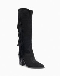 A seductive knee-high black suede cowboy boot with tonal top stitching and fringed sides. PRODUCT DESCRIPTION Pull on knee high boot with fringe details. Suede upper. 90mm/3.54" heel height. 6mm padded insole. Leather lining. Leather outsole with stitched welt. Signature Partlow plaque. Handcrafted in Italy. DETAILS AND CARE Brush off any dust or dirt with a soft bristle brush or soft cloth. Store boots in protective dustbags provided between wearings.