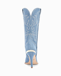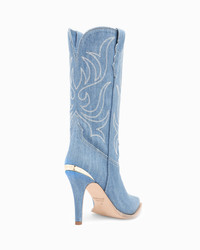 An iconic, pop culture-influenced embroidered denim cowboy boot. PRODUCT DESCRIPTION Pull on mid-calf boot. Denim upper with embroidery detail. 95mm/3.75" heel height. 6mm padded insole. Leather lining. Leather outsole with stitched welt. Signature Partlow plaque. Handcrafted in Italy. DETAILS AND CARE Brush off any dust or dirt with a soft bristle brush or soft cloth. Store boots in protective dustbags provided between wearings.