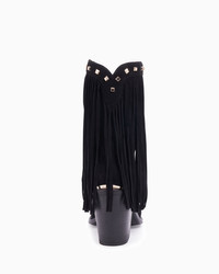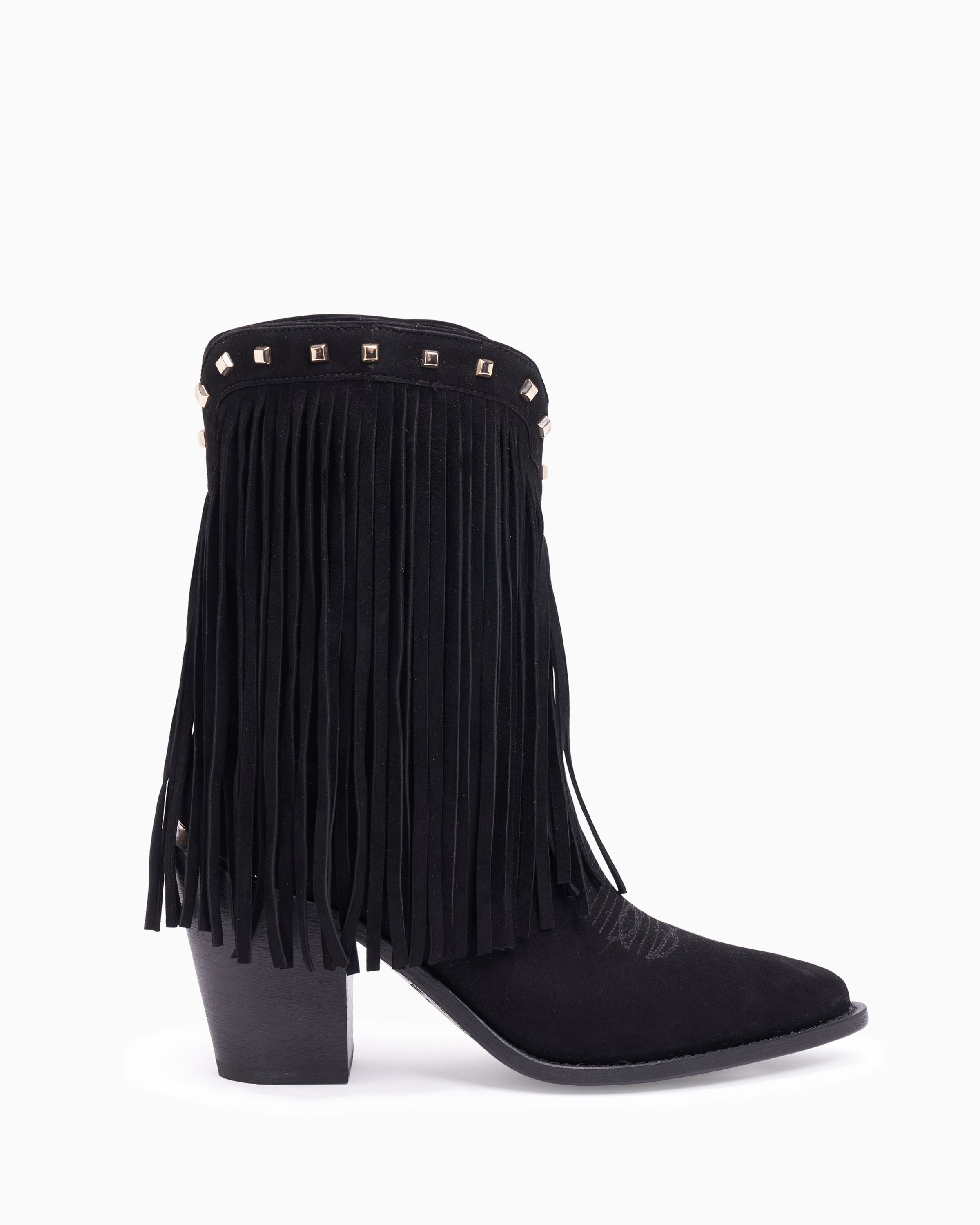 An alluring fringed black suede cowboy boot with studded top line. PRODUCT DESCRIPTION Pull on ankle boot with fringe and metal stud details. Suede upper. 90mm/3.54" heel height. 6mm padded insole. Leather lining. Leather outsole with stitched welt. Signature Partlow plaque. Handcrafted in Italy. DETAILS AND CARE Brush off any dust or dirt with a soft bristle brush or soft cloth. Store boots in protective dustbags provided between wearings.