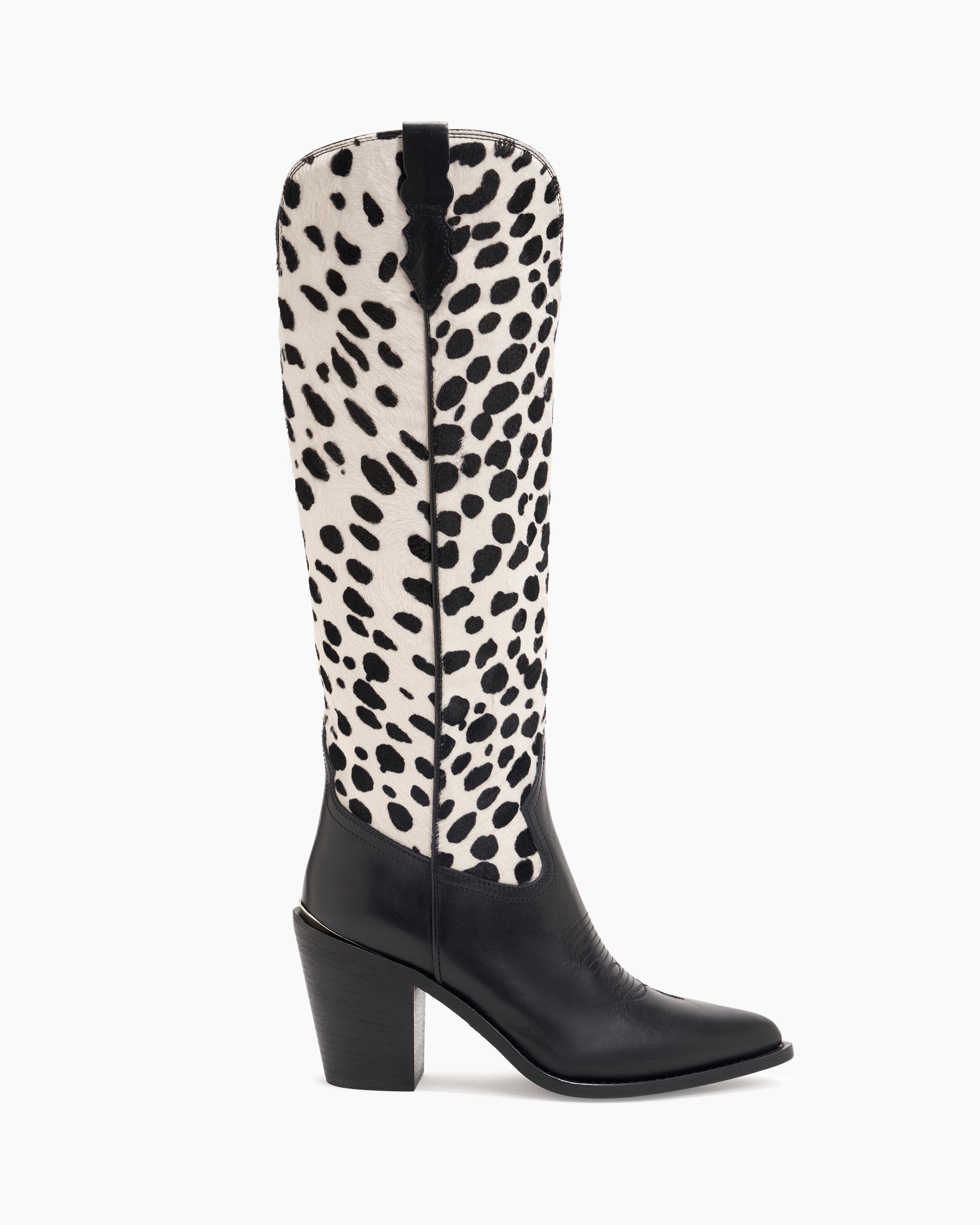 An evocative knee-high cowboy boot constructed from contrasting black leather and spotted calf hair. PRODUCT DESCRIPTION Pull on knee high boot. Calf and calf hair upper. 90mm / 3.14" heel height. 6mm padded insole. Leather lining. Leather outsole with stitched welt. Signature Partlow plaque. Handcrafted in Italy. DETAILS AND CARE Brush off any dust or dirt with a soft bristle brush or soft cloth. Store boots in protective dustbags provided between wearings.