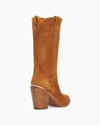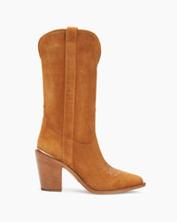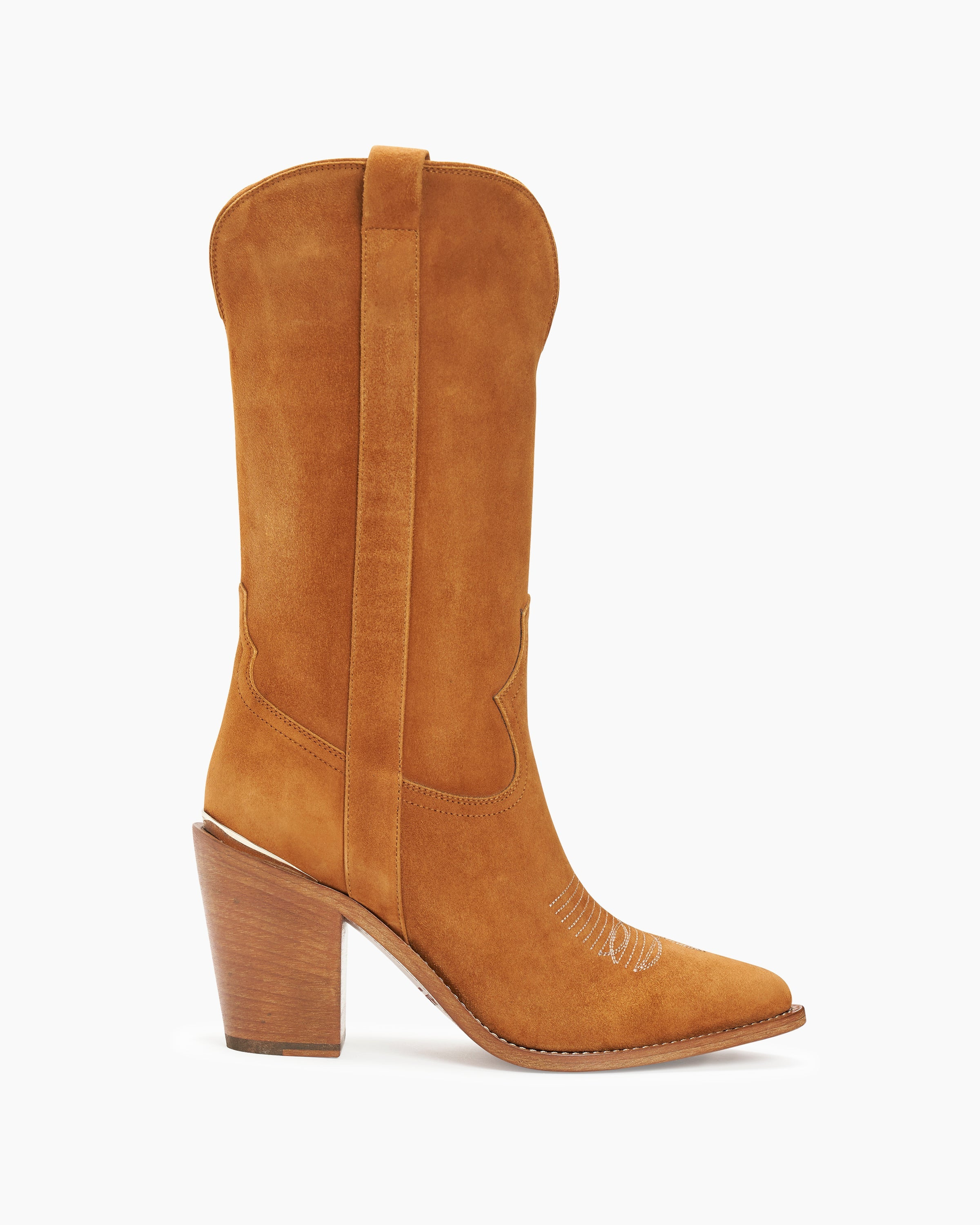 A luxurious warm camel suede cowboy boot with tonal stripe details. PRODUCT DESCRIPTION Pull on classic cowboy silhouette created from a suede upper with side stripe details, leather lining, and leather outsole with stitched welts. Heel height: 90mm/3.54”, 6mm padded insole. Featuring the signature Partlow plaque. Handcrafted in Italy. DETAILS AND CARE Brush off any dust or dirt with a soft bristle brush or soft cloth. Store boots in protective dustbags provided between wearings.