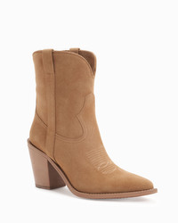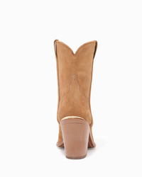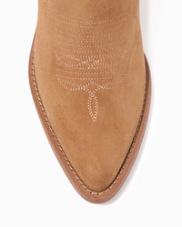 A luxurious cool brown suede cowboy ankle boot with tonal stripe details. PRODUCT DESCRIPTION Pull on ankle boot with classic cowboy silhouette. Suede upper. 90mm/3.54" heel height. 6mm padded insole. Leather lining. Leather outsole with stitched welt. Signature Partlow plaque. Handcrafted in Italy. DETAILS AND CARE Brush off any dust or dirt with a soft bristle brush or soft cloth. Store boots in protective dustbags provided between wearings.