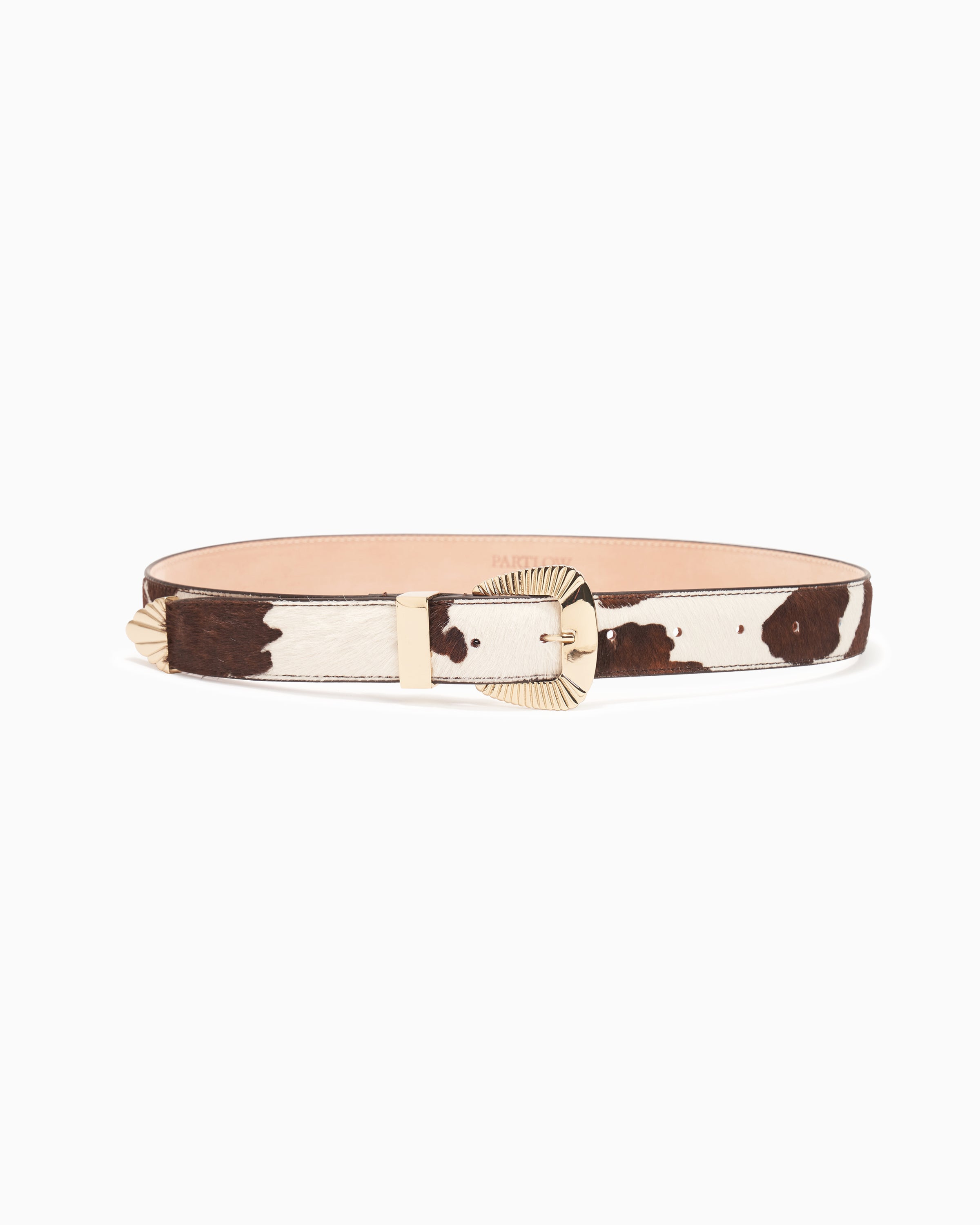 A luxuriously simple spotted pony hair belt with signature Partlow buckle. PRODUCT DESCRIPTION Classic belt in leather with signature Partlow buckle. Handcrafted in Italy. XS is 63-80cm (25-31”); S is 73-90cm (28-35”); M is 83-100cm (32-39”); L is 93-110cm (36-43”). The distance from the first to last hole is 17cm/6.6in, with 2cm between each hole.