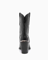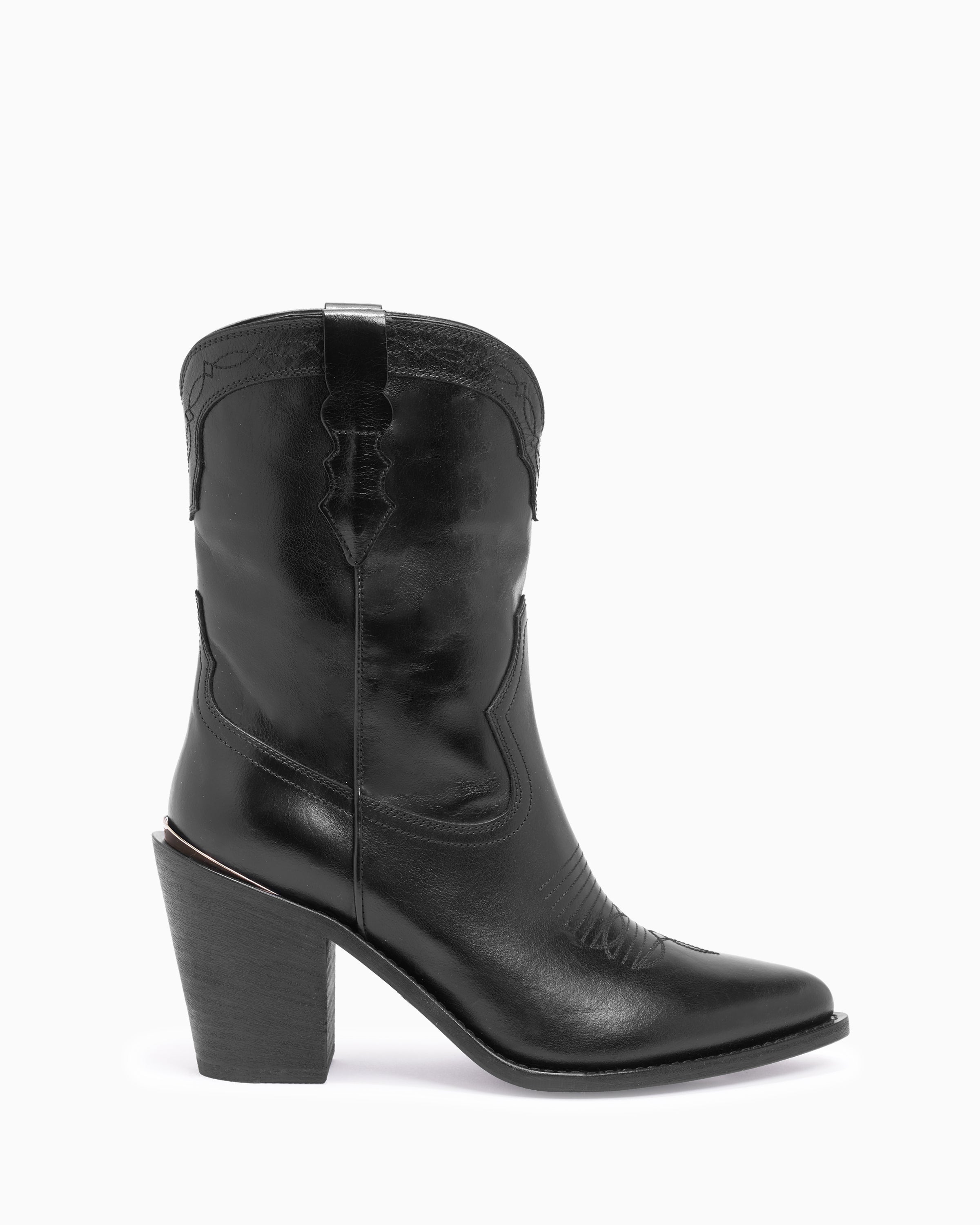 An exquisite black leather cowboy ankle boot with tonal embroidery at vamp and upper. PRODUCT DESCRIPTION Pull on ankle boot with western details. Shiny calfskin upper. 90mm/3.54" heel height. 6mm padded insole. Leather lining. Leather outsole with stitched welt. Signature Partlow plaque. Handcrafted in Italy. DETAILS AND CARE Brush off any dust or dirt with a soft bristle brush or soft cloth. Store boots in protective dustbags provided between wearings.