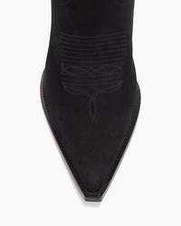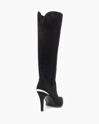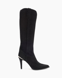 A sleek black suede knee-high boot with stiletto heel. PRODUCT DESCRIPTION Pull on knee high boot with classic cowboy silhouette. Suede upper. 95mm / 3.74” heel height. 6mm padded insole. Leather lining. Leather outsole with stitched welt. Signature Partlow plaque. Handcrafted in Italy. DETAILS AND CARE Brush off any dust or dirt with a soft bristle brush or soft cloth. Store boots in protective dustbags provided between wearings.